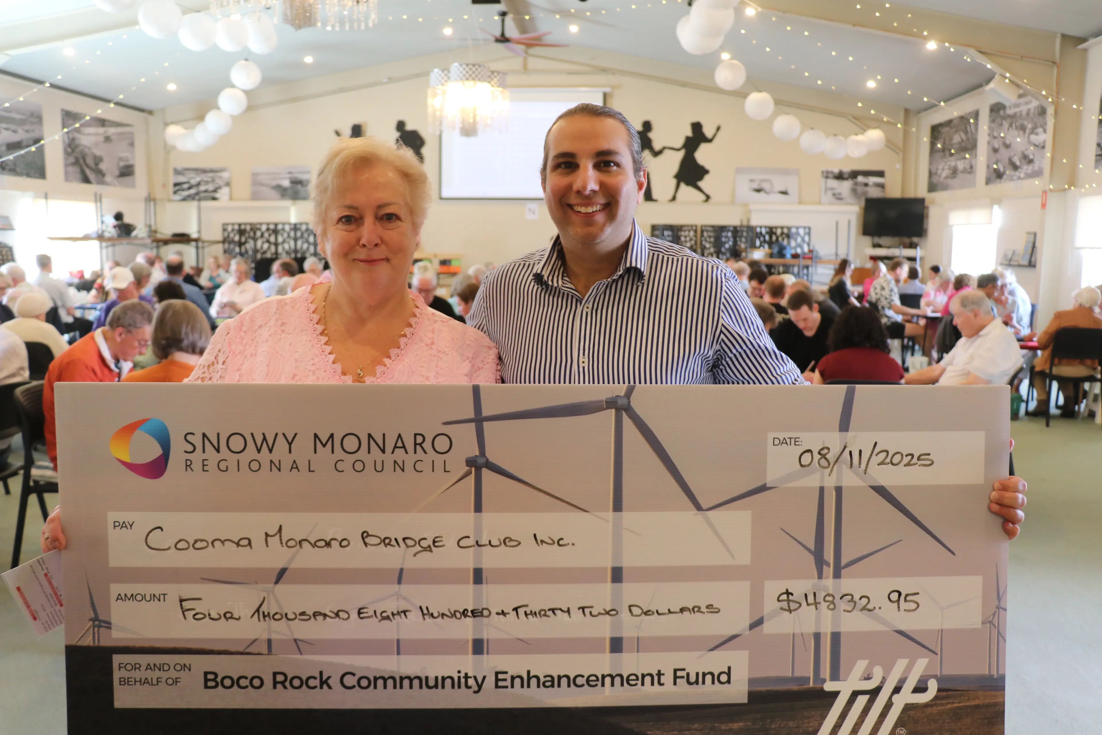 Before play started on Saturday, 8 November, Snowy Monaro mayor, Cr Chris Hanna, presented Monaro Bridge Club president, Edie Flanagan-Grumley, with a Boco Rock Community Enhancement Fund cheque for $4832.